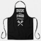 The perfect apron for the guy who loves to grill. Two crossed spatulas appear silhouetted in white under the words "Dude with the Food" in white on a black background. Personalize it with his name in retro script. Makes an ideal birthday or Father's Day gift.