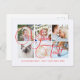 Personalized 6 family photos Universal eyecatching red Greetings Postcards featuring a stylish photo collage with 6 customized images, your greetings message in elegant chic handwritten script font, your name, date, year, message on the back in a modern and simple sans serif font.