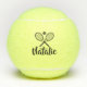 Personalized tennis balls printed with custom name and modern pretty script font and 2 simple tennis racquet.