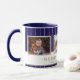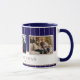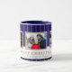 Personalized Family 3 Photo Collage Christmas Mug. Merry Christmas and a custom text. Add three photos. Personalize the text any way you wish or delete it. The background features a blue background with white stripes. Great as a Christmas gift or a keepsake mug for yourself.
