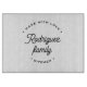 Add an elegant warmth to your kitchen with this personalized glass cutting board, beautifully designed, offering the durability and easy cleanup of tempered glass. The elegant circular “Made With Love” motif frames your custom family name, making it a standout piece for preparing meals, serving appetizers, or displaying as kitchen décor.