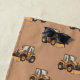 This construction-themed kids beach towel design is complete with a seamless pattern of yellow front loaders set against a simple brown background. There is a place to add your name at the bottom of the towel.