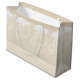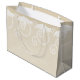 Large elegant wedding gift bag was done in a trendy color look and white royal lace pattern. A classic style white text area label has custom text, on both sides of the bag, ready to personalize.