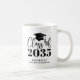 This sleek and modern graduation mug gift features a classic graduation cap and tassel at the top, with “Class of” in elegant handwritten script just below, followed by the class year, which can be customized to “Class of 2026” or any year. Beneath the year, the graduate’s name and school are displayed in timeless serif fonts for a polished, balanced look.