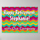 Custom personalized retirement poster with name and company. It's all fun and games once the job career ends. This cool fresh and funky poster (can be used as a wall decoration, door decoration, table decoration or other) for the retired person is great for a party favor, gag gift or just to show off your accomplishment. Rainbow of colors, in a chevron zigzag print.
