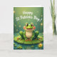 The image shows an adorable, bright green cartoon frog sitting happily on a lily pad floating in calm water. The frog has big expressive eyes, rosy cheeks, and a friendly smile, giving it a warm and welcoming personality. Small shamrocks float around the pond, while soft glowing lights in the background create a magical, cozy atmosphere. Above the frog, playful white lettering reads “Happy St. Patrick’s Day!” The overall style is whimsical, cheerful, and perfect for festive cards and gift products.