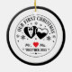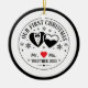 Celebrate the magic of your first Christmas as a married couple with this beautiful "Our First Christmas Mr. & Mrs." personalized ornament. Featuring an elegant black-and-white design with a tuxedo heart and a dress heart, a sweet "Together 2025" detail, and festive snowflake accents.
