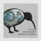Silhouette of a New Zealand kiwi bird in black adorned with a sparkly, shiny, blue, green pāua shell colour body overlaid with a curved green fern koru. Kiwi, paua, and fern korus are popular in NZ art, as is the colours black and green. There is 3 lines of custom text at the base of this NZ design to personalise it, perhaps with a message of greeting, but you can remove it completely if preferred. The Kiwi bird is an icon for Aotearoa NZ being both a native bird and the name adopted by New Zealanders in reference to themselves. On this piece it is set against a light silver grey colour.