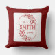 Elevate your home decor with this elegant and timeless personalized family name throw pillow. Featuring a chic deep red and white color palette, this design showcases a delicate botanical wreath surrounding your custom surname in a sophisticated serif font.