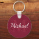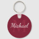features personalized name in white script font style and monogram in light burgundy red serif font style as background, on burgundy red background.