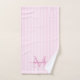 Add a touch of elegance to your bathroom with this personalized monogram bath towel set. Featuring a soft pink and white striped background, each towel is customized with your monogram initial and name in a fancy script font for a timeless, feminine look.