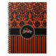 This monogrammed orange, black, and white damask with stripes pattern notebook has template boxes for you to add your name, monogram, or other text. If you need help customizing this item, please email niteowlstudio@gmail.com for assistance.
