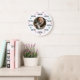 The design is accented with cute, subtle cat-themed decorations, including pink-and-red hearts, green-and-teal paw prints, and stylized cat ears and whiskers. The center features a customizable circular area perfect for displaying a favorite photo of your beloved cat or pet, along with a custom name. This clock is a perfect piece of decor for a nursery, kitchen, living room, or any space that needs a touch of personalized, feline fun.