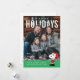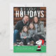 This festive, customizable photo card is a perfect way to send season's greetings. It features a large full-bleed photo template and the phrase "HAPPY HOLIDAYS" in bold white lettering across the top. The card's bottom section has a vibrant green banner where a classic Peanuts graphic shows Snoopy dressed in a full Santa Claus suit. The banner includes customizable fields for the Family Name, individual signatures, and the Year. This design offers a fun, non-denominational greeting combined with a classic Snoopy Christmas look and a modern photo layout.
