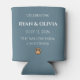 Celebrate your special day with a customized keepsake that keeps drinks cold and is full of personal touches. This double-sided foam can cooler (koozie) is designed specifically for the wedding of Ryan and Olivia on July 13, 2026, at The Willow Farm in California. One side features a clean, text-centric design on a beautiful slate-blue-grey background with a charming little brown paw print—perfect for pet-loving couples. The reverse side flips to a fun, visual-led design featuring a vintage-toned sepia photo of the happy couple in an archway, framed by artistic light pink paint brush strokes, and the bold text 'DRINKS ON ME!' in a classic font and 'Love, Ryan & Olivia' in script. This is the ultimate, versatile wedding favor that combines sentimental photo details with useful function. Ideal for rustic, farm, or pet-friendly weddings. Printed on high-quality foam to insulate standard 12oz cans.
