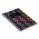 Abstract geometric design of interlacing circles, bright rainbow colors on black background