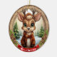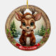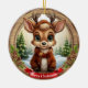 Personalized Rustic Xmas Pine Wood Decor. Framed Wooden Custom Deer Holiday Decoration. Personal Name Gift Tag. Whimsical Winter Wonderland Woodland Wildlife Deer with Antlers Character Ceramic Ornament! Featuring customizable white text saying "Merry Christmas" on a vibrant red ribbon – easily swap it out for a loved one's name to make a truly personal artwork for tree with charming accents of pine cones and evergreen branches for that cozy look. At the center is a festive reindeer in cartoon graphic style, dressed in a coat, hat and scarf, evoking the spirit of an animal with a cute twist. The background showcases an enchanting snow landscape complete with a snowy trees, capturing the joy of the season. This two-sided, personalizable pine wood artwork ensures seeing the adornment from every angle – illustration appears on both front and back, so it always looks complete no matter how it spins while hanging. Perfect for gifting or decorating, and you can transfer this unique design to a variety of other products, from mugs to cards and more! Personalize your pinecone embellishment and bring home this delightful keepsake today – visit Zazzle to customize and order now! 🦌🎄