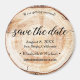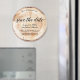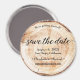 Personalize these unique wedding Save the Date circle magnets. It features a printed wood grain cut disc, perfect for your rustic wedding. Modern script font for the words “Save the date” with long tailed embellishment swashes. Chic and stylish.