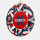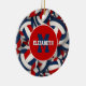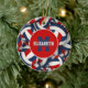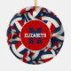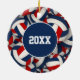 This sporty volleyball themed ceramic ornament features a pattern of seemingly endless, randomly arranged red, white and blue volleyballs turned every which way - personalize with name and monogram on the front and commemorative year on the back - by katz_d_zynes