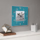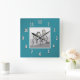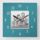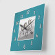 A simple wall clock where the time circles around you or your beloved ones! Add your personal photo and this clock will transfer into a valuable item for yourself or someone you'd like to surprise! The colored square frame is teal, and digits are white with black shadow. There exists 5 color variations of this design - teal, black, silver, blue and pink.