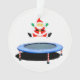 Creative trampoline Christmas keepsake ornament holiday gift featuring trampoline-jumping Santa Claus and special place for personalized name on back.