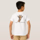 This unisex t shirt is suitable for both boys and girls. The front, featuring a giraffe, is personalized with a name while the back has a different giraffe and says "Never Stop Exploring." It is fully customizable.