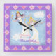 This adorable watercolor fairies clock is the perfect addition to a little girl's room! Featuring two fairies dancing in the clouds, holding magic wands and wearing tiaras, surrounded by a bright lavender border with stenciled hearts and flowers. A charming and magical design that's sure to delight, and you can personalize it for a special touch. Perfect for nursery decor or any fairy-themed room!