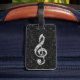 Elegant, glamourous Personalised Luggage Tag with Leather Strap. Beautiful, dazzling trendy printed image silver and diamonds bling jewels musical note on a chic black sparkly glitter printed image background. A cute, classy, fashionable, stylish, pretty gift for her or any music lover.