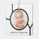 This modern Christmas Photo Ornament is decorated with the word JOY in black on a white background.