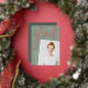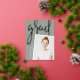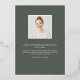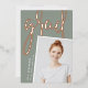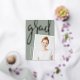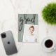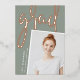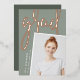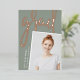 A modern photo graduation announcement features a vertical or portrait orientated photo with a slight tilt for a fresh look. "Grad" appears in brush lettered rose gold foil script typography. Personalise with the graduate's name, school, and graduation year. Add a personal message to the back, along with an additional photo.
