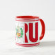 Peru National Flag Patriotic Coffee Mug with the delightful inscription "Peru" which is infused with the pattern and the colours from the national flag. Design is finished with the two double thin lines in complementing colours on the top and on the bottom of the cup. Colour inside the cup and on the cup handle is perfectly balanced with the rest of the colours. Here is the fantastic companion for the daily cup of coffee. Charming design, lovely colours and the unique look makes it perfect gift for any occasion. © 2021 CoutriesOfTheWorld