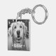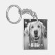 Photo keychain featuring your custom pet photo with with the pet's name as a white text overlay flanked by two hearts.