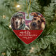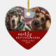 Heart Shaped Personalised Printed Photo Christmas Ornament with a custom design with a photo of your dogs or puppies with "Merry ChristMUTTS" and their names and year on a festive rustic red typography design.