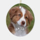 Cute, elegant stylish ornament . This design features a photo of your furry friend with a simple and modern first name monogram and heart with paw print accent in white. A coordinating pattern of Glittery turquoise paw prints dresses up the back side of the ornament. You can personalise the design for your new puppy / cat , your family's dog , cat or pet.