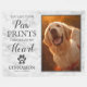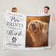 Pet dog memorial fleecy blanket featuring a treasured photo of your beloved dog, a modern white marble background, a paw print with a heart, a sympathy remembrance quote that reads "you left your paw prints forever on my heart", plus their name, and dates.