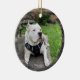A true keepsake for your pet features 2 circular grunge photos on dark wood print ceramic ornament.