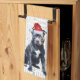 Here's a fun holiday kitchen towel or year-around hand towel. An adorable watercolor illustration of a cute bluenose pit bull Santa dog who sits with a fun 'woof' word art background. The dog wears a Santa hat.