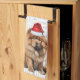 Here's a fun holiday kitchen towel with an adorable watercolor illustration of a Chow Chow dog who sits with a fun 'woof' word art background. The dog wears a Santa hat.