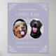 Personalise your chic lavender purple french lilac theme wedding with an open bar sign. Add photos of your dogs, cats or any pets and personalise all of the text to read whatever you like. Perfect for an elegant, old money with vintage charm wedding theme for the chic, classic and timeless couple. Designed by Simple Desert Designs Studio for Zazzle. Message us for custom colours to match your exact wedding theme.