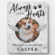 Elegant pet memorial keepsake plaque featuring a faux marble background, the title 'forever in our hearts', paw prints, a photo of your beloved pet dog or cat, angel wings, their name, and the sympathy saying 'I'll see you on the other side'.