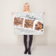 Celebrate the life of your best friend with this elegant and unique personalised pet memorial fleece blanket. This beautiful photo collage blanket is the perfect gift for you and your loved ones to bring happy memories of your lovely dog, cat, guinea pig, rabbit, ferret, or other pet animal. This design features a 3 photo collage with a photo booth style (preferably add photographs with a horizontal orientation); date and pet's name in a black handwritten style typography. It also displays the quote: "a big piece of my heart lives in heaven" in capital sans serif grey font decorated with cute little pink hearts. This memorial blanket has a simple paw print pattern and light grey background.