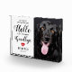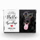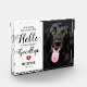 Modern pet memorial photo block featuring a photo of your beloved dog/cat, a red heart with a paw print centre, the saying "you were my favourite hello and my hardest goodbye", their name, and dates.