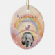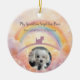 Commemorate your beloved furry friend with this heartfelt pet memorial ornament featuring a watercolor Rainbow Bridge background and the loving phrase “My Guardian Angel Has Paws.” Designed with a small, fluffy white dog reminiscent of a Maltese, this personalised ornament brings comfort during the holiday season or any time of year.