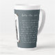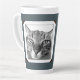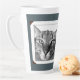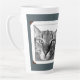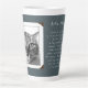 Tall latte mug with animal photo template (cat, dog, or any pet) and paragraph to tell about the special characteristics of the animal. Dark grey-blue colour with an old-fashioned photo album frame around a square photo template. The text beside the photo has a place at top for the pet's name, with a paragraph beneath to include lots of fun information about the special family member. Text is a hand-printed font style in white and can hold info about how the pet was found or adopted, his or her unique abilities and traits, likes and dislikes, quirky behaviour, etc.. This tall mug makes a sweet gift to any animal lover, and could be created in memory of a pet who has passed on.