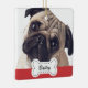 Add pet name in playful script typography on a simple dog bone name plate. Add custom pet photo.