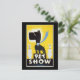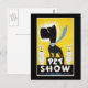 Vintage WPA artwork advertising a pet show. Yellow background with large black dog in centre and two spotted dogs on either side. Colours are yellow, black and white