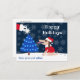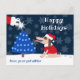 This cute postcard is for pet sitters, dog walkers, and any pet-related business. A little dog is looking up at Santa, who is putting a star on top of a blue Christmas tree with blue lights. The front text says "Happy Holidays" and below it says "from your pet sitter." All text is fully customizable.
