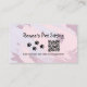 This business card for pet sitters or walkers has pink and purple painted background on both sides with the details in mixed typography. Includes QR Code on both sides, cute paw prints, and social media icons for Facebook and Instagram. Fill in the details with your name, services, phone number, website, email, social handle, qr code website address, and special messages.