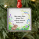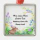 This design features a brown bunny as Peter Cotton Tail. He is sitting in a bed of greens and flowers shaped in a horse shoe. The flowers in blue, green, purple and yellow are in bloom and at the top is a bird perched on a vine of flowers. These ornaments are dated on the reverse side on some styles. Put all your own information on this ornament. Available in assorted styles.