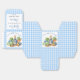 Peter rabbit with a blue jacket and garden vegetables baby shower favours personalised favour box template. A cute bunny in a blue jacket standing in veggie garden for a baby boy baby shower pastel blue gingham favour boxes suitable for candy almonds nut favours, can fit about 20 coated almonds